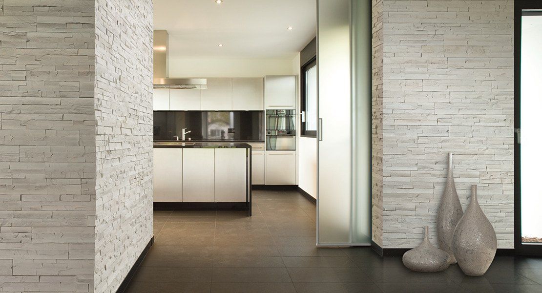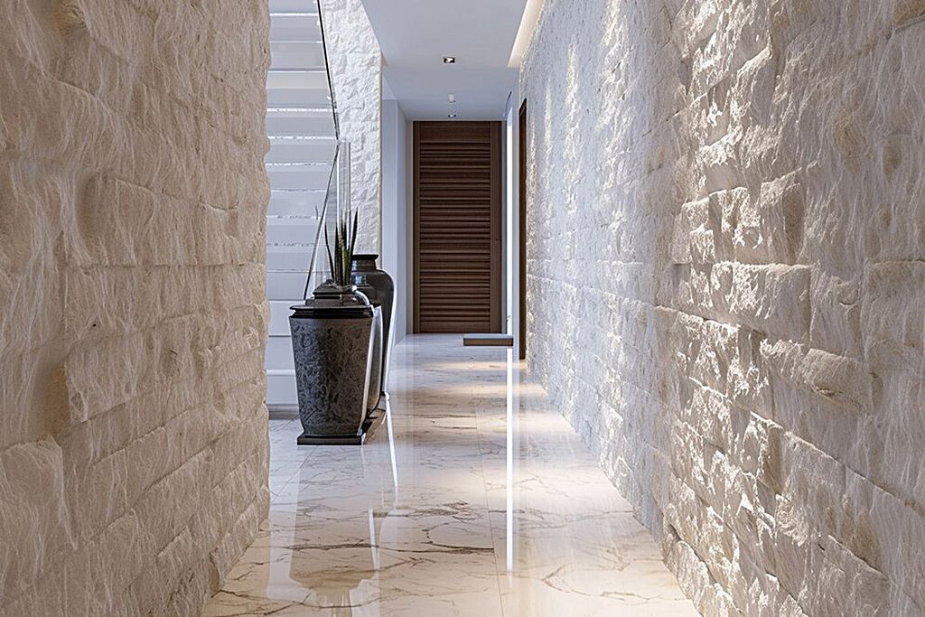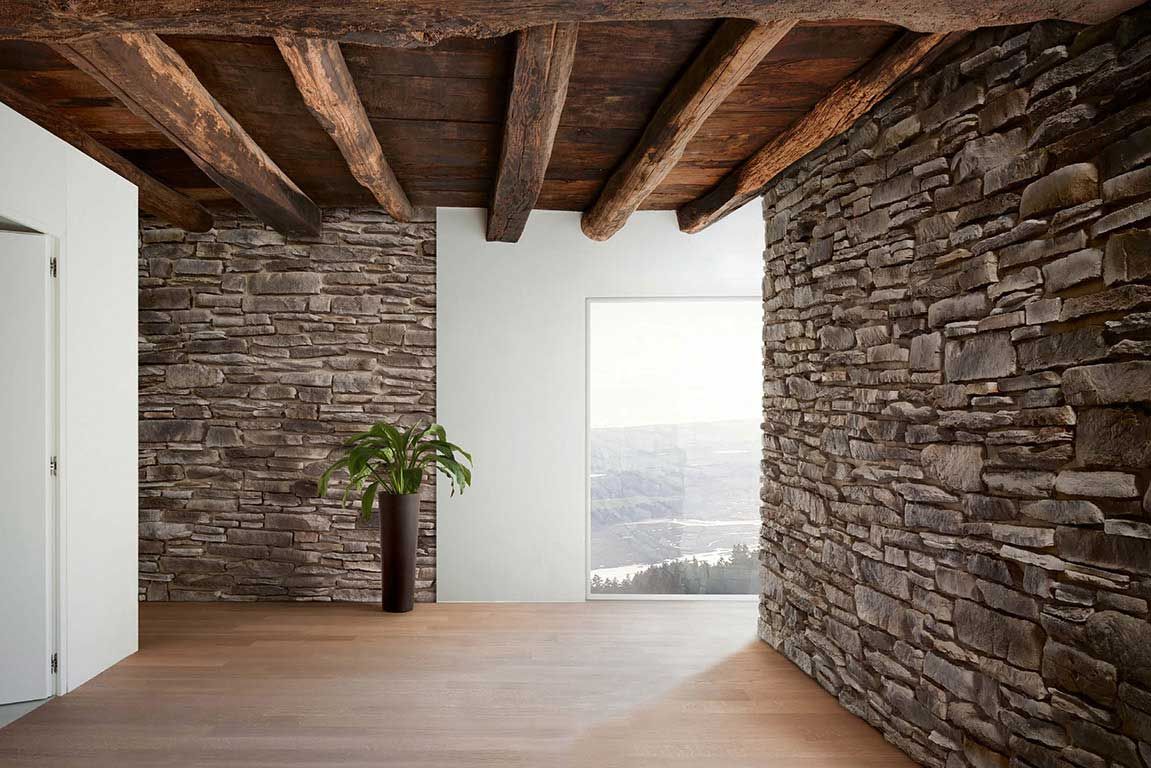 Materiali decorativi e pietre tecniche che aggiungono profondità e carattere, disegnando pareti come superfici narrative.